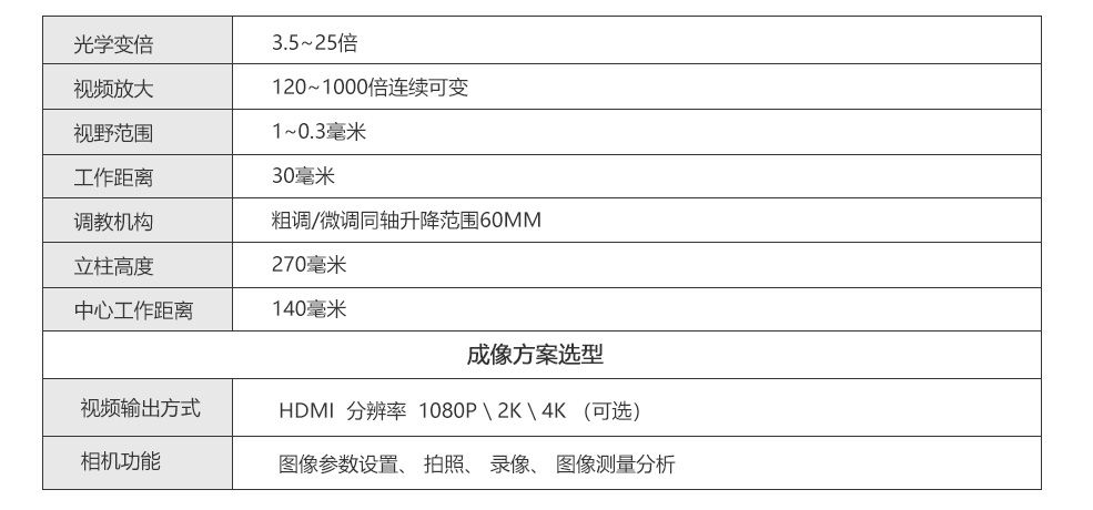 高倍视频显微镜,采用0.7~5倍连续可变镜筒,0.5倍摄影目镜,以及10倍长焦物镜,拥有3.5~25倍超大光学变倍比,30毫米超长工作距离,适用于液晶模组、OIT、导电粒子、光通讯器件,半导体等各类工业原材料的生产与分析检测。